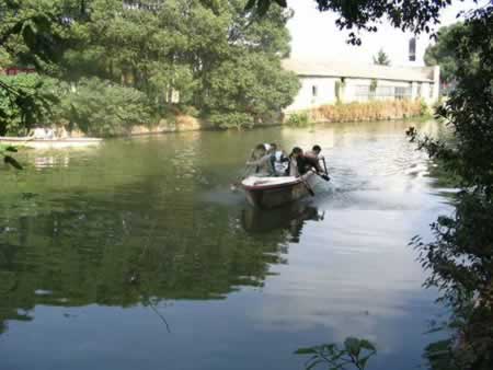 劃船比賽開始了,第一組有策略得想把第二組擠到一邊。