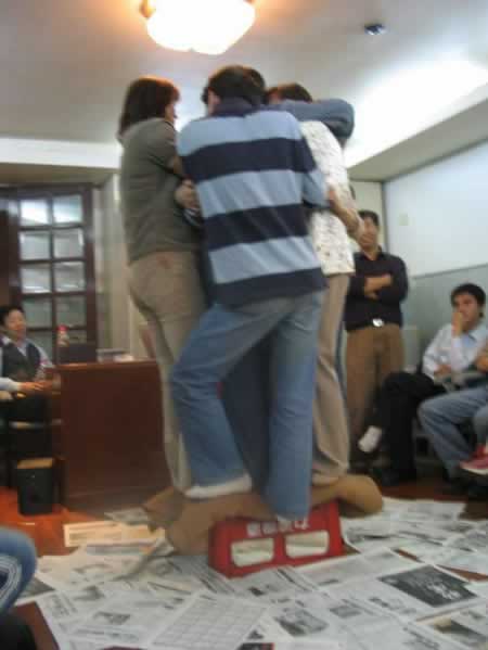 第二組的成員在組長的帶領下,全組成員團結一致,緊緊得抱在一起,堅持了20分鐘,取得了第一名。