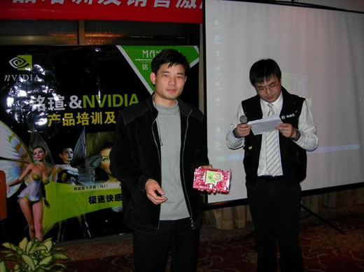 這次經(jīng)銷商會(huì)的互動(dòng)活動(dòng)也是相當(dāng)成功,抽獎(jiǎng)、有獎(jiǎng)問答及現(xiàn)場(chǎng)拍賣一系列活動(dòng)使得現(xiàn)場(chǎng)氣氛十分熱烈。幸運(yùn)的經(jīng)銷商抽得銘瑄極光系列顯卡一張。NVIDIA侯宇濤先生為其頒獎(jiǎng)。
