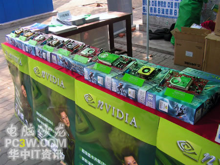 校園行也力圖讓廣大學生真實的體驗來自NVIDIA的強大新技術所帶來的震撼效果,特別是SM3.0、HDR以及SLI這三大顯示技術。產品展臺上擺滿了各款銘瑄支持這“三重威力”的顯卡產品。從入門級的6200TC直到最近被各大IT媒體所熱炒的6800GS,展示產品可以說是琳瑯滿目。