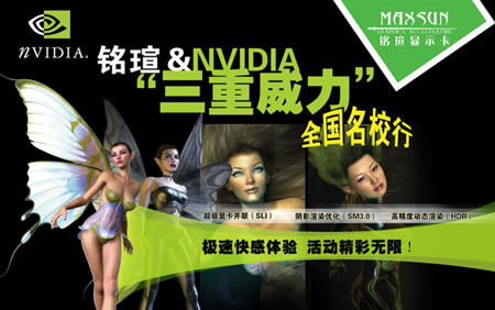 全球最大的顯示芯片供應(yīng)商之一的NVIDIA早已家喻戶曉,而銘瑄顯卡是國(guó)內(nèi)最大的顯卡品牌之一,長(zhǎng)期以來(lái)雙方一直保持著良好的合作關(guān)系,此次再度合作舉行校園巡展活動(dòng),正是“三重威力”先進(jìn)顯示技術(shù)推廣的延續(xù)。