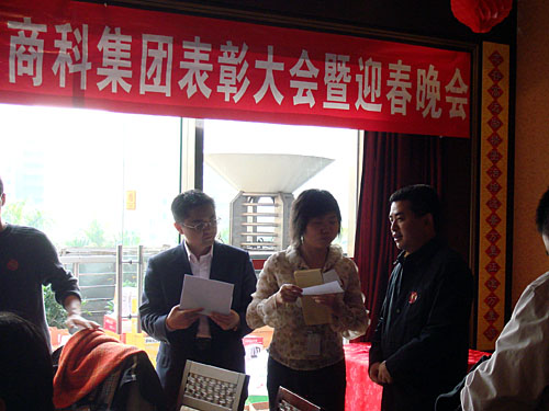 晚會開始前商科集團領導對本年度表現優秀的員工進行了嘉獎和表彰他們是:第四季度部門之星:技術部 :敖亞軍、業務部:吳翠、市場部:臧永剛,第四季商科標兵:財務部:羅春菊,第四季度銷售標兵 :田勇,2006年度杰出員工:馮燕蘭,優秀職能經理 :楊毅,優秀經理 : 邵清泉