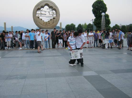“兩人一腳”,一邊賣力的向前進(jìn),一邊還要保護(hù)報(bào)紙不能有破損。瞧這“兩兄弟”感情多好,不斷引來(lái)陣陣笑聲。