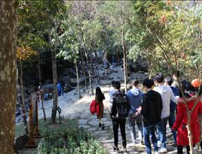 下午我們來到了享有“南國仙山”美譽的姑婆山,姑婆山分布有仙姑寨、仙姑大草坪、仙姑瀑布、天堂頂、九天峽谷、情人林、古窯沖和方家茶園八大主題景區,內含茶壽石、聚寶盆、仙人指路、八步仙蹤等88處神奇景觀,久聞四季宜人,萬物共榮。森林覆蓋率高達99.55%,負離子含量高達15萬個/cm³,我們吸氧來啦!