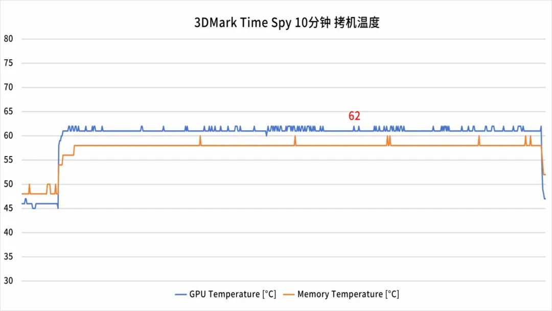 除了頻率優(yōu)勢(shì),散熱效能在顯卡的穩(wěn)定性和耐用性方面同樣至關(guān)重要。銘瑄 Intel Arc B580顯卡采用正逆轉(zhuǎn)導(dǎo)流散熱設(shè)計(jì),相鄰風(fēng)扇的旋轉(zhuǎn)方向不同,有效減少繞流,增加進(jìn)風(fēng)量,從而顯著提升了散熱效能。以MAXSUN Intel Arc B580 iCraft 12G為例,在進(jìn)行10分鐘的Time Spy烤機(jī)測(cè)試時(shí),顯卡溫度僅為62度,在高負(fù)載運(yùn)行時(shí)仍能保持低溫,穩(wěn)定輸出性能。這種優(yōu)秀的散熱設(shè)計(jì)不僅延長了顯卡的使用壽命,也為用戶提供了更佳的使用體驗(yàn)。