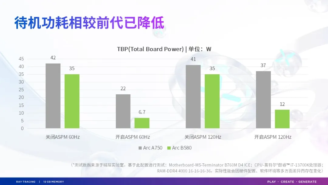 此外,MAXSUN Intel Arc B580 iCraft 12G在功耗控制上也進(jìn)行了優(yōu)化,待機(jī)功耗相較前代有了明顯降低,在不同電源管理模式下都表現(xiàn)出比前代更優(yōu)的待機(jī)功耗數(shù)值,減少不必要的電力消耗,保持高效能耗比。