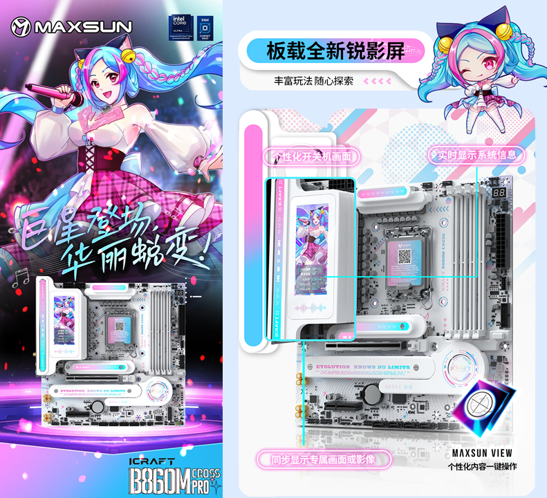 作為個(gè)性化白色主機(jī)的核心骨架,銘瑄iCraft B860M CROSS PRO璦珈主板,作為顏值旗艦,全覆蓋著藍(lán)粉漸變的二次元紋路,每一處細(xì)節(jié)都透著精致感。吸睛亮點(diǎn)莫過(guò)于全新配備的3.4英寸銳影LED顯示屏,不僅能實(shí)時(shí)顯示CPU溫度、內(nèi)存頻率等系統(tǒng)信息,還能自定義開關(guān)機(jī)畫面,甚至支持桌面映射,同步展示專屬壁紙或游戲畫面。搭配配套軟件MAXSUN View,玩家可以盡情解鎖無(wú)限自定義玩法,讓主板成為主機(jī)的 “個(gè)性門面”。