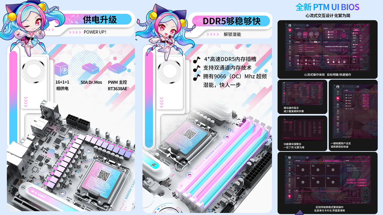 硬核玩家看重的性能,這款主板同樣毫不妥協(xié)。16+1+1 相供電設(shè)計(jì)搭配核心供電 50A Dr.Mos,強(qiáng)悍的供電能力足以輕松駕馭英特爾 ® 酷睿™ Ultra 9 處理器 285K,即便在《戰(zhàn)地 6》滿負(fù)載運(yùn)行時(shí),也能保持穩(wěn)定輸出,避免因供電不足導(dǎo)致的卡頓、掉幀。4 條雙通道DIMM的DDR5內(nèi)存插槽經(jīng)過(guò)優(yōu)化線路布局,擁有 9066(OC)Mhz 的超頻潛能,玩家只需通過(guò)銘瑄 PTM UI 圖形化 BIOS,幾步簡(jiǎn)單操作就能調(diào)整供電參數(shù)、拉滿內(nèi)存頻率,輕松為《戰(zhàn)地6》優(yōu)化整機(jī)性能,小白也能輕松上手。