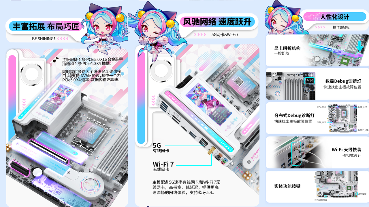 拓展性與網(wǎng)絡(luò)體驗(yàn)更是直擊玩家需求。1條PCIe5.0 X16合金裝甲插槽+1條 PCIe4.0 X4 插槽,搭配3個(gè)滿速M(fèi).2硬盤接口和 4個(gè)6G SATA接口,無(wú)論是加裝高速固態(tài)硬盤還是拓展其他硬件,都能從容應(yīng)對(duì)。多人對(duì)戰(zhàn)時(shí)就怕網(wǎng)絡(luò)卡頓,這款主板搭載英特爾BE200無(wú)線網(wǎng)卡,支持Wi-Fi 7 和藍(lán)牙5.4,再加上5G有線網(wǎng)口的雙旗艦網(wǎng)絡(luò)配置,傳輸速度又快又穩(wěn),讓你在《戰(zhàn)地6》的百人對(duì)戰(zhàn)中告別延遲,快速響應(yīng)每一次戰(zhàn)術(shù)指令。更貼心的是,顯卡瞬拆結(jié)構(gòu)和 Wi-Fi天線快裝設(shè)計(jì)讓裝機(jī)、升級(jí)更便捷,數(shù)顯+分布式 Debug 診斷燈能一眼識(shí)別故障位置,省去繁瑣排查步驟,讓玩家專注享受裝機(jī)與游戲的樂(lè)趣。