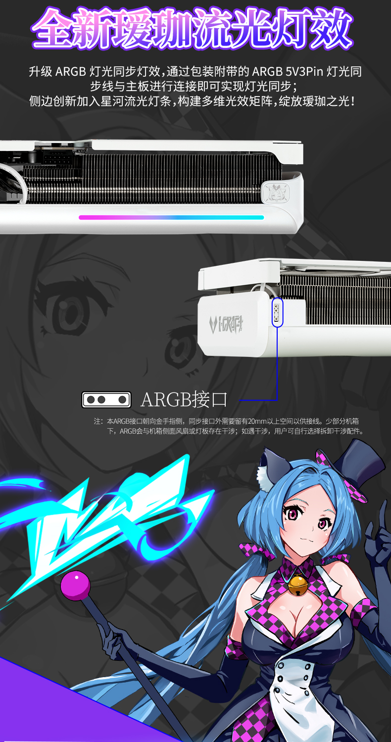 外觀上,銘瑄GeForce RTX 5080 iCraft OC16G璦珈這款顯卡與主板完美呼應(yīng),堪稱純白主機(jī)的 “顏值擔(dān)當(dāng)”。采用全新白曜銀爍鍍層工藝,通過(guò)環(huán)保免噴涂注塑技術(shù)打造出珍珠白漸變閃銀效果,無(wú)需化學(xué)噴涂,就能呈現(xiàn)出隨光影變化的高級(jí)質(zhì)感,機(jī)箱燈光每一次切換,都能帶來(lái)不一樣的視覺驚喜。溫潤(rùn)細(xì)膩的白色基調(diào)適配各類主流機(jī)箱風(fēng)格,更融入了璦珈系列的二次元基因:背板左側(cè)印著全新升級(jí)的 “魔術(shù)師” 璦珈形象,右側(cè)風(fēng)扇鏤空區(qū)域則用線條勾勒出小巧 Q 萌的璦珈,細(xì)節(jié)處盡顯設(shè)計(jì)巧思,讓顯卡成為主機(jī)里的 “二次元寶藏”。