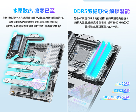性能方面,這款主板采用16+1+1 相 DR.MOS 供電搭配 8 層服務器級 PCB,實現高性能與低損耗的完美平衡,能充分釋放酷睿Ultra 200S系列處理器的性能。散熱設計同樣拉滿,供電部分上方的冰原散熱裝甲由6mm鍍鎳銅管連接,裝甲與MOS之間的接觸面采用高品質導熱硅條;同時配備金屬固態硬盤冰原散熱片,全面保障硬件冷靜運行,性能持續在線不 “掉鏈”。內存與擴展能力也十分出色。它配備4條高速DDR5內存插槽,支持雙通道內存技術,最高支持256GB容量,還擁有8800MHz (OC)超頻潛能,搭配CUDIMM內存可輕松突破頻率上限,讓《戰地6》的游戲紋理加載速度大幅提升,進入戰場更快一步。