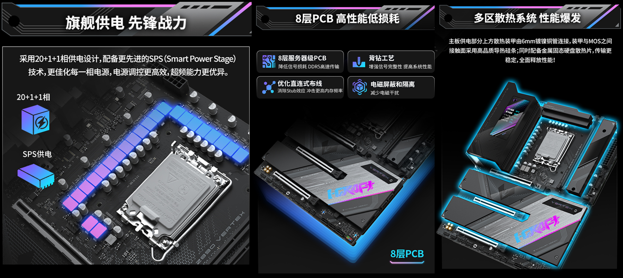 作為銘瑄 iCraft 系列的旗艦力作,銘瑄iCraft  Z890 Vertex(珠峰)主板像是整套硬件的 “性能中樞”,搭載20+1+1相SPS供電設計,搭配8層服務器級PCB,實現高性能低損耗,能充分釋放英特爾酷睿Ultra 9 285K處理器的澎湃性能,即便長時間高負載運行也能穩定輸出,為顯卡發揮強悍性能筑牢基礎。散熱配置更是拉滿,供電部分的散熱裝甲由6mm鍍鎳銅管連接,裝甲與MOS之間貼合高品質導熱硅條,加上金屬固態硬盤散熱片,全面保障硬件冷靜運行,避免長時間高負載游戲中的掉幀卡頓問題。