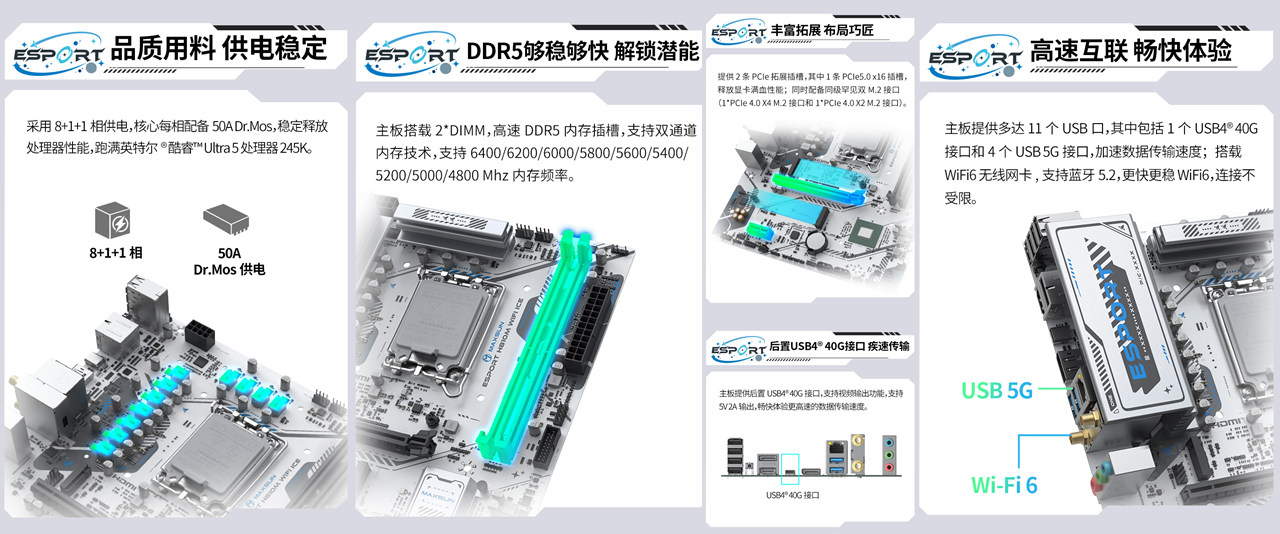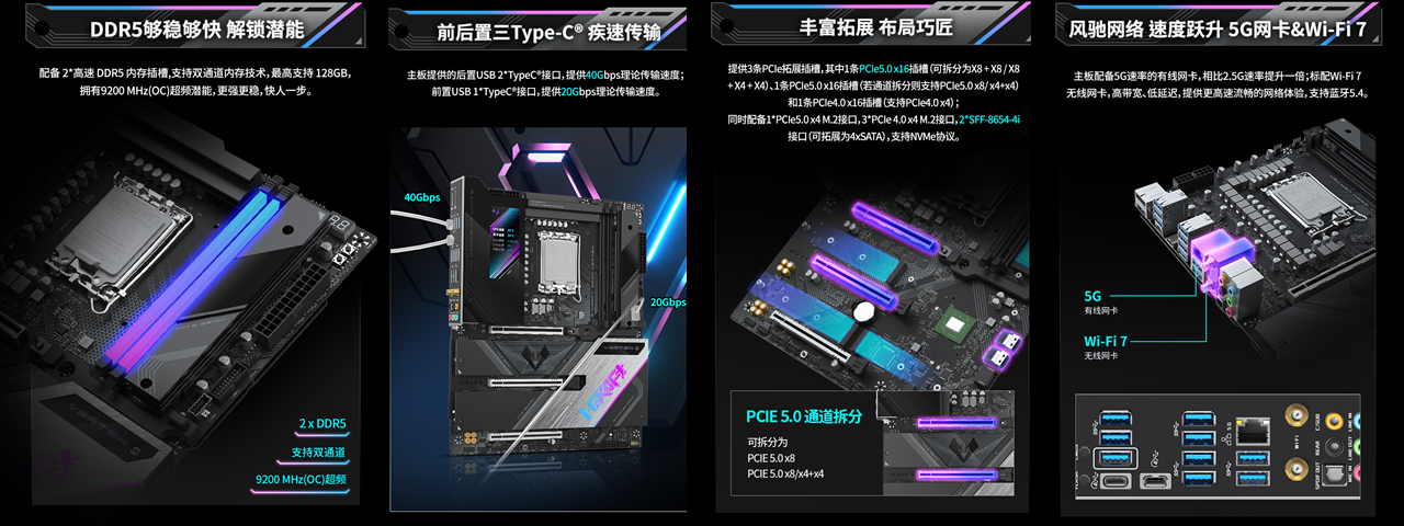 在拓展與體驗上,這款主板也是誠意滿滿。配備2 條高速 DDR5 內存插槽,支持雙通道技術與最高 128GB 容量,更擁有9200MHz(OC)超頻潛能,搭配CUDIMM內存可輕松突破頻率上限,大幅提升新游紋理加載速度,告別畫面延遲;3 條 PCIe 拓展插槽搭配多規格 M.2 接口,完美兼容大容量高速固態硬盤與多硬盤存儲陣列,再多新游也能 “盡收囊中”;Intel BE200 Wi-Fi7 無線網卡 + 5G 速率有線網卡,配合藍牙 5.4,讓聯機玩《惡煞車手》時告別網絡延遲,再也不會因網絡波動錯失戰機。