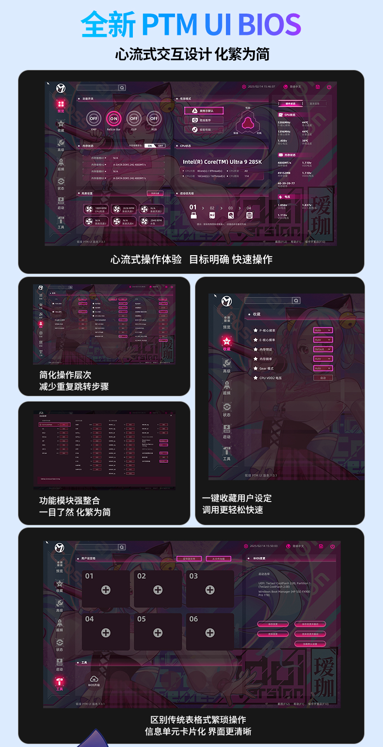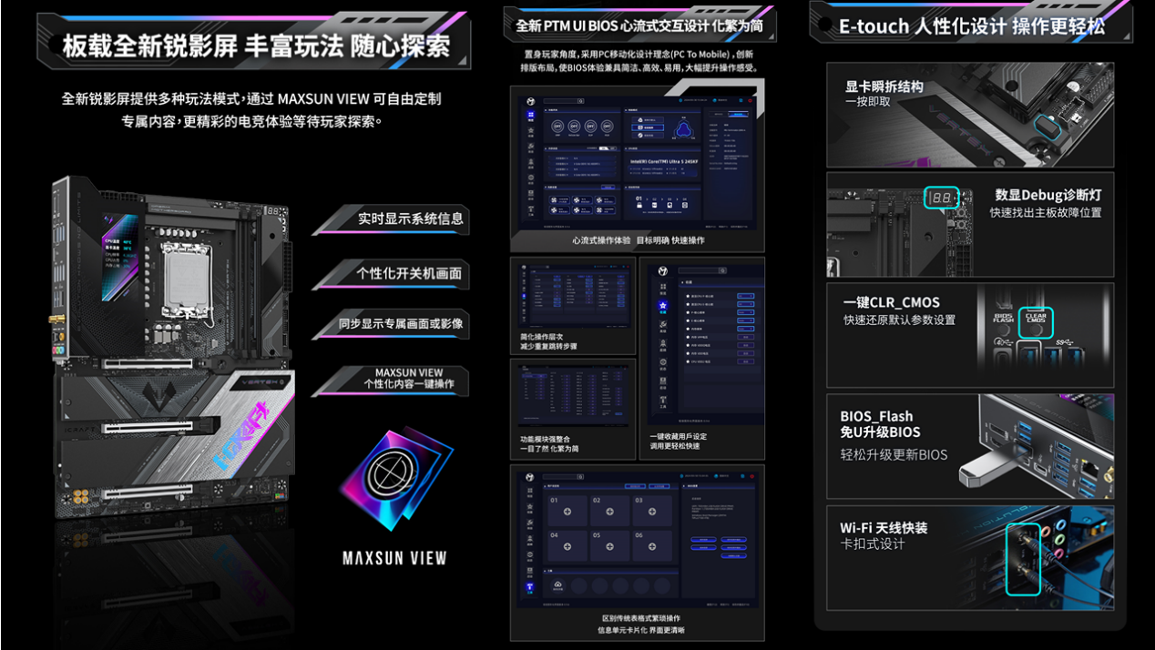 更貼心的是,板載的全新銳影 LED 屏就像硬件的 “智能儀表盤”,實時顯示 CPU 溫度、內存頻率等核心參數,無需切換軟件就能掌握硬件狀態,顏值與實用性雙在線;升級的 PTM UI BIOS 采用心流式交互設計,裝機新手也能輕松上手,數顯 Debug 診斷燈、一鍵 CLR_CMOS 等設計,讓硬件調試全程省心。