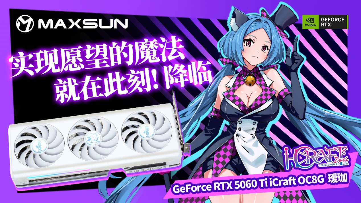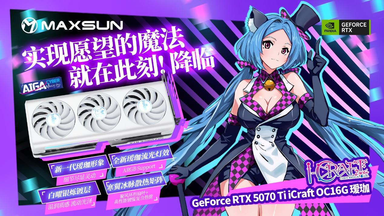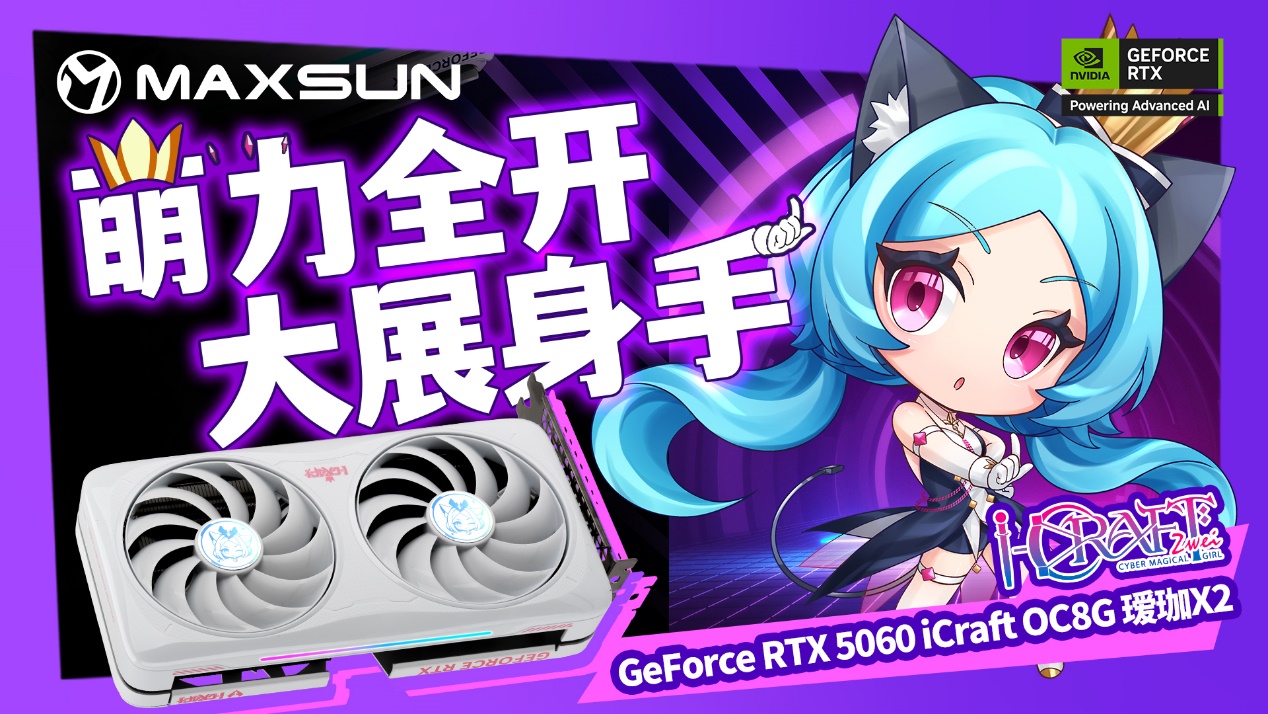 銘瑄GeForce RTX 5060 iCraft OC8G璦珈 X2 顯卡延續溫潤白色外觀,IP視覺升級,全新 Q 版璦珈形象亮相背板,萌力十足,側邊的星河流光燈條搭配 ARGB 燈光同步,讓主機顏值再上一個臺階;散熱方面,10CM 聚風環形扇葉集中氣流、減少損耗,進口高端滾珠軸承控制噪音,風扇啟停技術兼顧散熱與靜音,高性能鍍鎳復合熱管與大面積鰭片,讓熱量快速導出。更貼心的是,這款顯卡只需 550W 電源就能支撐整機穩定運行,無需額外升級電源,進一步降低裝機成本,讓入門玩家以高性價比解鎖游戲快樂。