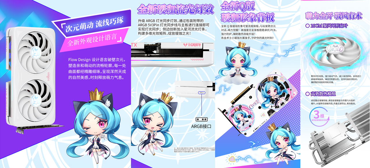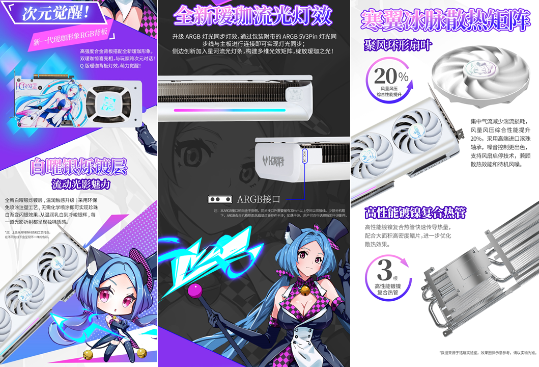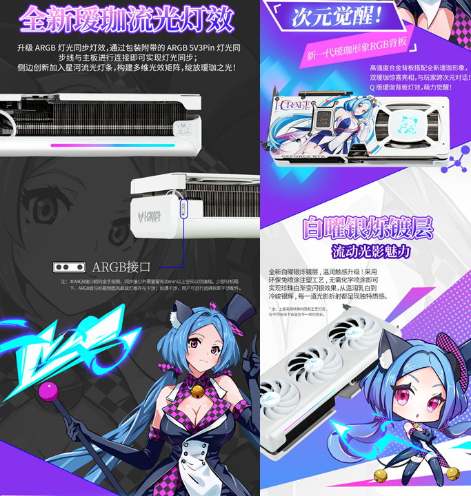 這款顯卡不僅性能硬核,顏值更是戳中二次元玩家的心。升級后的白曜銀爍鍍層搭配億萬納米光刻星光紋理,環保注塑工藝打造出珍珠白漸變閃銀效果,光線流轉間,璀璨的光影軌跡在顯卡表面流動,觸感溫潤又高級;一體環抱式中框讓線條更流暢,側邊的星河流光燈條搭配璦珈 RGB 合金背板,構建出多維光效矩陣,每一縷光影都透著專屬的二次元氛圍,支持 ARGB 燈光同步后,更是讓顯卡成為個性化主機的顏值擔當。