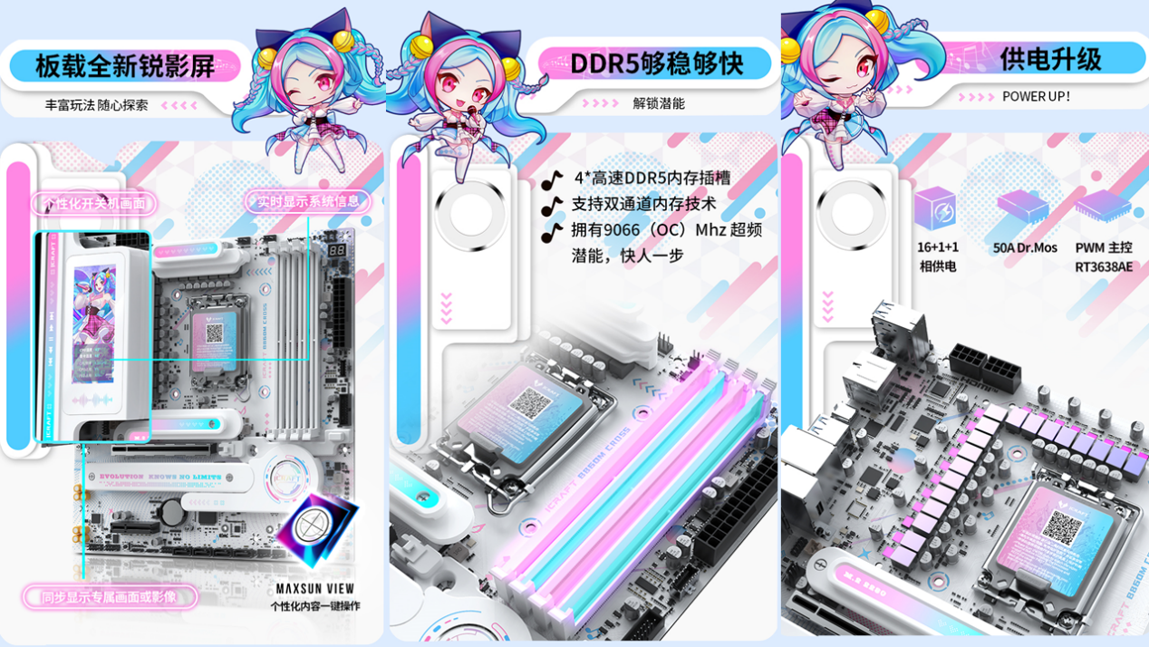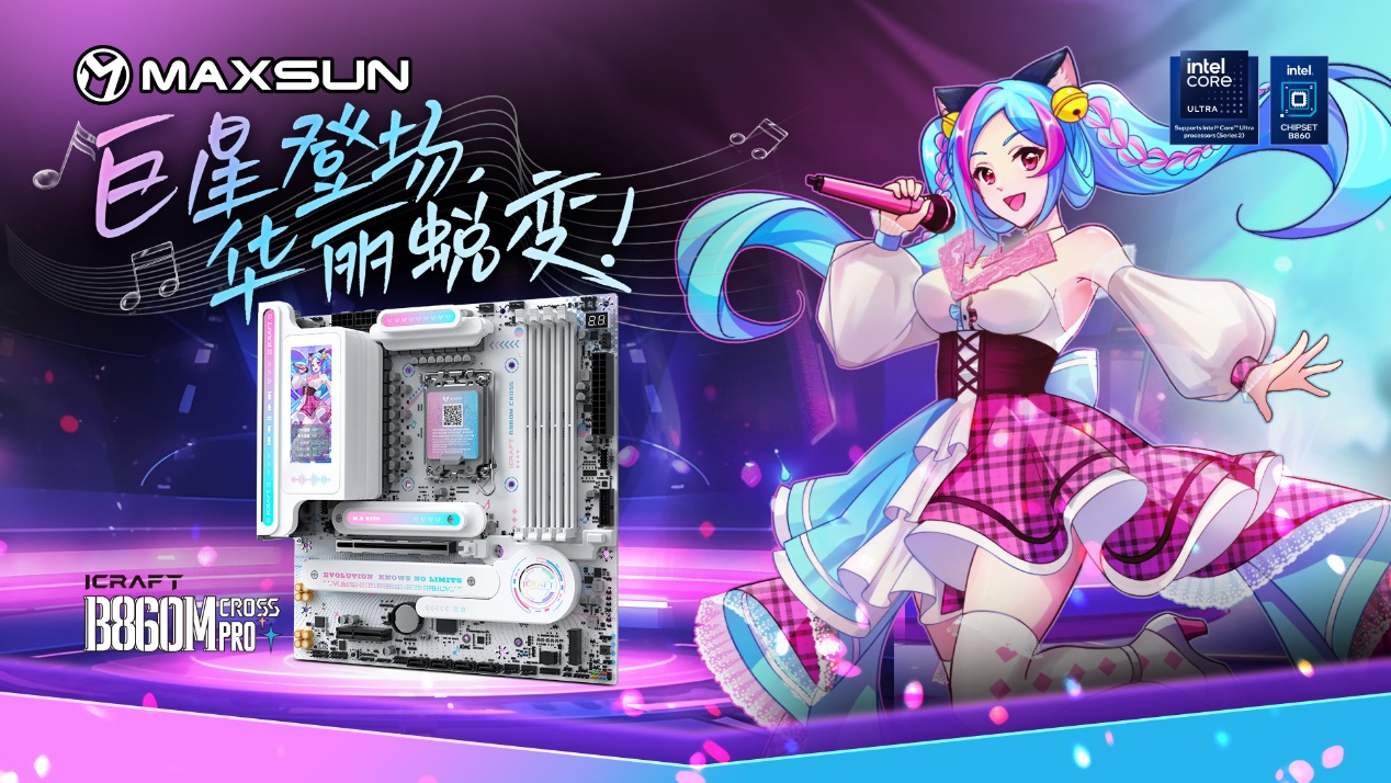 銘瑄iCraft B860M CROSS PRO璦珈主板,是顏值與性能兼具的 “實力選手”。 它采用 16+1+1 相供電設計,核心供電 50A Dr.Mos,能輕松駕馭英特爾酷睿 Ultra 9 285K 處理器,為 2K 游戲提供穩定的性能支撐;4 條高速 DDR5 內存插槽支持雙通道技術,擁有 9066MHz(OC)超頻潛能,搭配 CUDIMM 內存可突破頻率上限,大幅提升新游紋理加載速度,讓游戲畫面更流暢。顏值與體驗上,這款主板的 3.4 英寸銳影 LED 屏堪稱吸睛亮點,不僅能實時顯示系統信息、自定義個性化開關機畫面,還能開啟桌面映射,同步顯示專屬畫面或影像,通過 MAXSUN View 軟件可解鎖無限自定義玩法,讓主機更有專屬感;全面支持的 PTM UI BIOS,操作簡潔高效,新手也能輕松上手。
