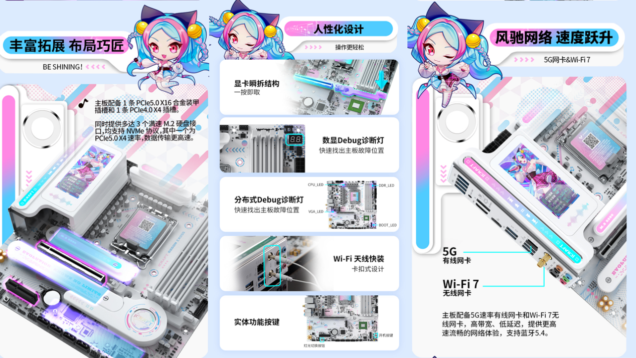 在拓展與實用設計上,這款主板同樣貼心。1 條 PCIe5.0 X16 合金裝甲插槽 + 1 條 PCIe4.0 X4 插槽,搭配 3 個滿速 M.2 硬盤接口與 4 個 6G SATA 接口,滿足各類拓展需求,再多游戲與資料也能輕松容納;前后置雙 USB-C、后置 USB4 40G 接口,支持最高 40Gbps 傳輸速率,數據傳輸快人一步;5G 速率有線網卡 + Wi-Fi7 無線網卡,配合藍牙 5.4,高帶寬低延遲,聯機游戲再也不怕網絡拖后腿;顯卡瞬拆結構、Wi-Fi 天線快裝卡扣,讓硬件拆裝更便捷,數顯 + 分布式 Debug 診斷燈,一眼就能識別故障位置,省去繁瑣的排查步驟,讓玩家把更多時間留給游戲。