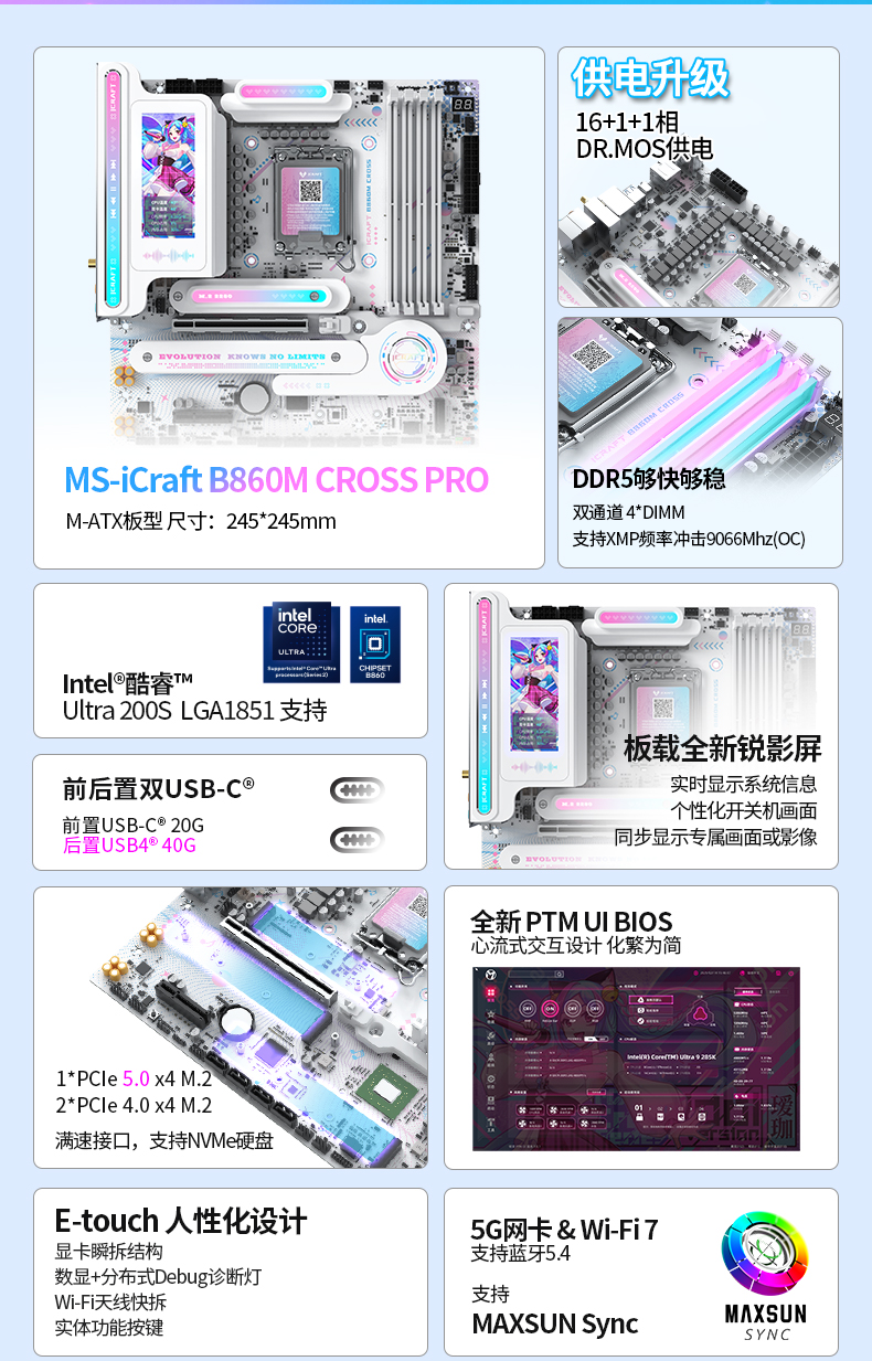 銘瑄 iCraft B860M CROSS PRO主板將次元美學與旗艦性能完美融合,全覆蓋藍粉漸變二次元紋路,3.4 英寸銳影 LED 顯示屏為核心亮點,支持自定義開關機畫面、桌面映射,搭配 MAXSUN View 軟件可解鎖無限個性化玩法,成為主機的 “個性門面”。供電采用 16+1+1 相 50A Dr.MOS 組合搭配 RT3638AE PWM 芯片,為新處理器提供澎湃且穩定的電力輸出,高負載下依舊平穩。4 條 DDR5 插槽擁有 9066(OC)MHz 的超頻潛能,完美兼容新處理器原生的 DDR5-7200 MT/s 內存,專業 PCB 優化布線有效降低高頻信號損耗與串擾。拓展上配備 PCIe5.0 X16 合金裝甲插槽 + 3 個滿速 M.2 接口,滿足高端顯卡與高速存儲拓展需求;網絡同樣搭載 Wi-Fi 7+5G 有線的雙高速組合,搭配藍牙 5.4,保障全場景網絡體驗。此外,顯卡瞬拆、Wi-Fi 天線快裝設計,讓裝機與硬件升級更便捷。