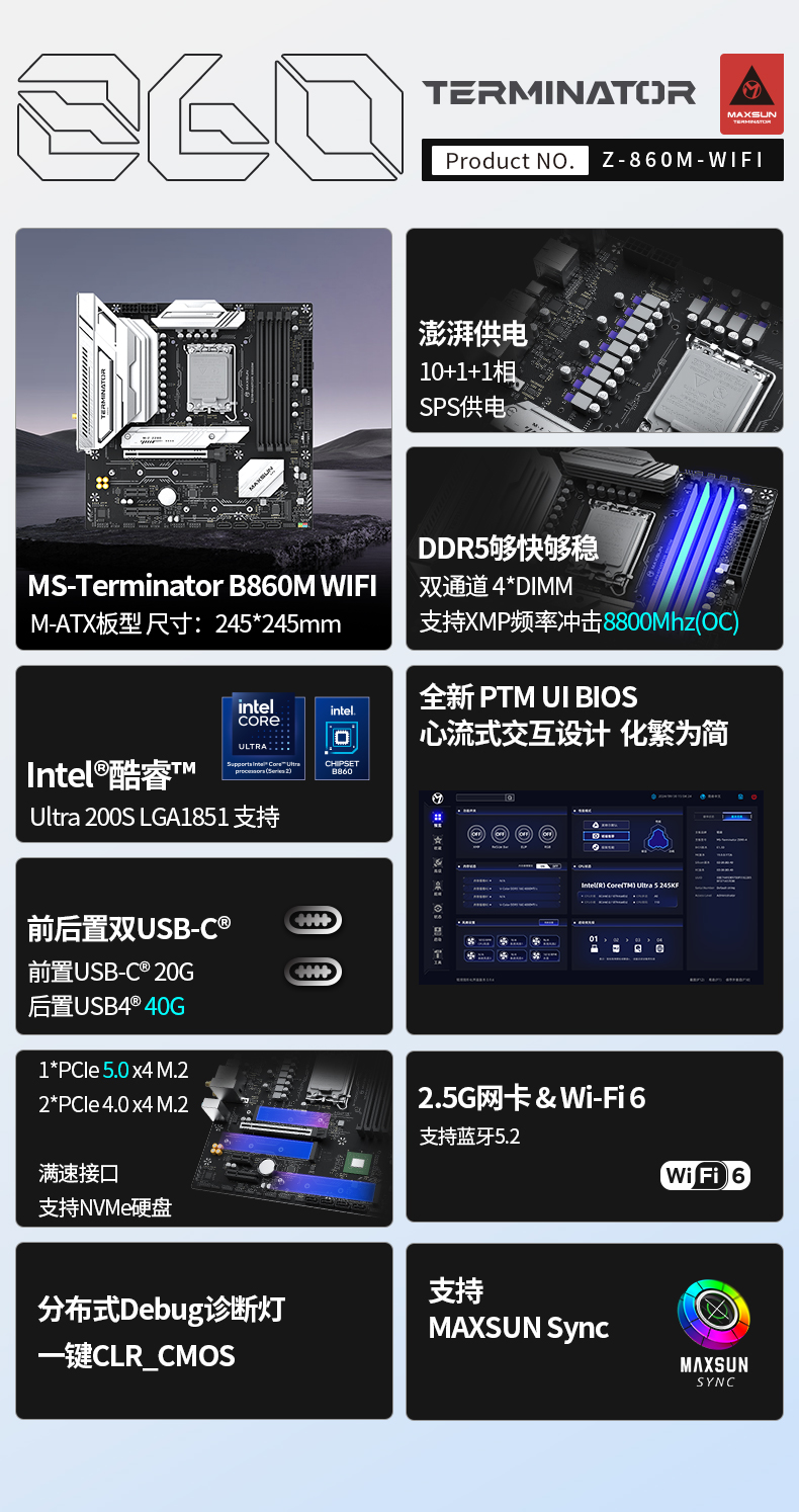 銘瑄 Terminator B860M WIFI主板采用 Micro-ATX 的板型,延續終結者系列經典黑銀撞色設計,低調中盡顯科技感,是入門裝機、設備升級的高性價比之選。供電采用 10+1+1 相 SPS 設計,搭配大面積散熱裝甲與高品質導熱硅條,為新處理器提供持續平穩的電力輸出,滿負載下無卡頓掉幀問題。4 條 DDR5 插槽支持 192GB 大容量與 8800MHz 超頻潛能,配合新處理器對 CUDIMM 內存的支持,大幅提升系統數據讀寫與多任務處理能力。拓展性表現亮眼,PCIe5.0 X16 合金裝甲插槽為顯卡提供穩固支撐,3 個滿速 M.2 接口(含 1 個 PCIe5.0 x4)+ 多規格 PCIe 插槽,滿足硬件拓展與海量存儲需求;前后置雙高速 Type-C 接口實現疾速數據傳輸。網絡上配備 2.5G 有線 + Wi-Fi 6 無線網卡,搭配藍牙 5.2,有效避免網絡卡頓延遲,適配游戲、辦公、娛樂等多場景使用。