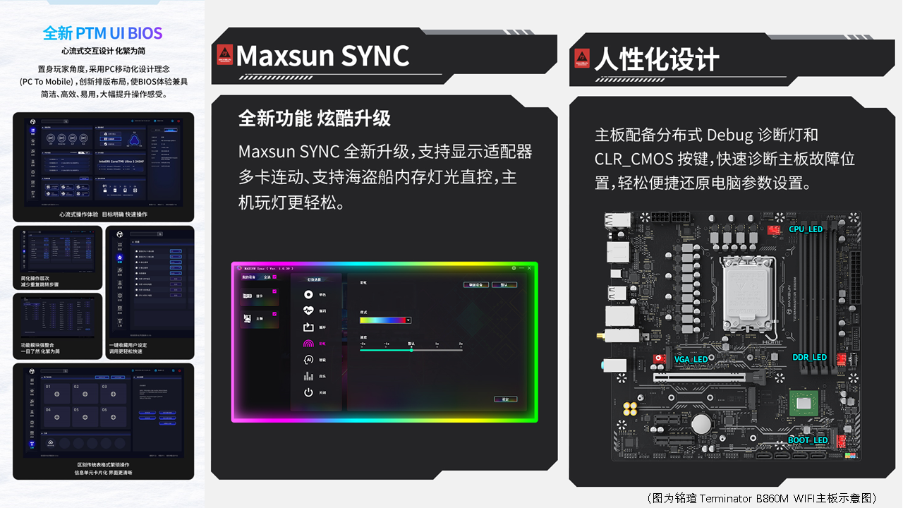 除了各有特色的硬核規格,銘瑄這四款主板均搭載全新 PTM UI BIOS,模塊化設計讓交互層級不超 2 層,新手也能輕松操作;同時配備分布式 Debug 診斷燈、CLR_CMOS 快捷按鈕,故障排查更省心,還支持 RGB 光效同步,可與外設聯動打造個性化裝機氛圍,從操作便捷性到個性化設計實現全方位體驗升級。